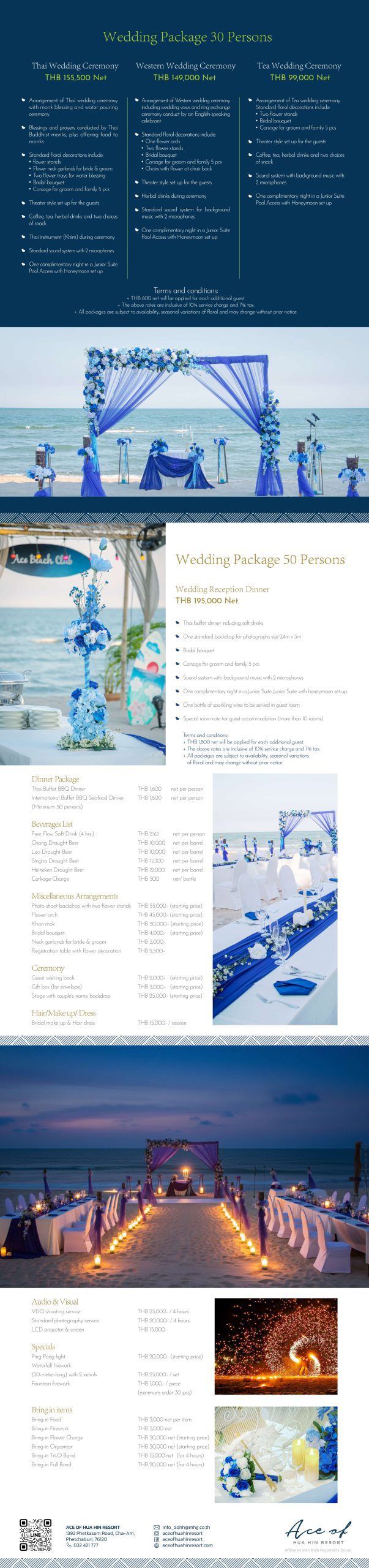 ไม่ว่าคุณกำลังวางแผนงานแต่งงานขนาดกลางหรืองานแต่งงานขนาดใหญ่ ทางเรามีทีมงานที่สามารถตอบสนองความต้องการของคุณที่ Ace of Hua Hin Resort เเละมีพื้นที่ริมชายหาดที่กว้างขวางของรีสอร์ท เป็นสถานที่ที่เหมาะสำหรับพิธีแต่งงานหรือลานกลางแจ้งและลานระเบียงของเราที่ให้พื้นที่ที่ยืดหยุ่นและเหมาะกับกิจกรรมที่หลากหลาย